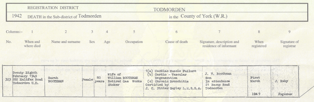 Sarah Boothman was born Edrika Robinson in Holland on 25th November 1869. She died on 28th February 1949.
