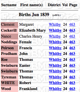 The listing of birth records registered in Whitby (shown right) and also FamilySearch, show that Esther had a twin, Thomas Swinburn, born and Christened at the same time as Esther. (There is an error in the Whitby listing as the heading is June 1839 whereas the birth was clearly registered in April.)