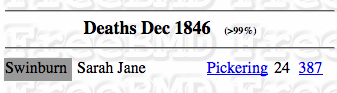 In addition to the twins, Esther was there, as was Robert aged 5 but his twin sister Sarah Jane had died in December 1846. This record was hard to find as the census enumerator misspelled ‘Swinburn’ - the error is also shown on the transcript.