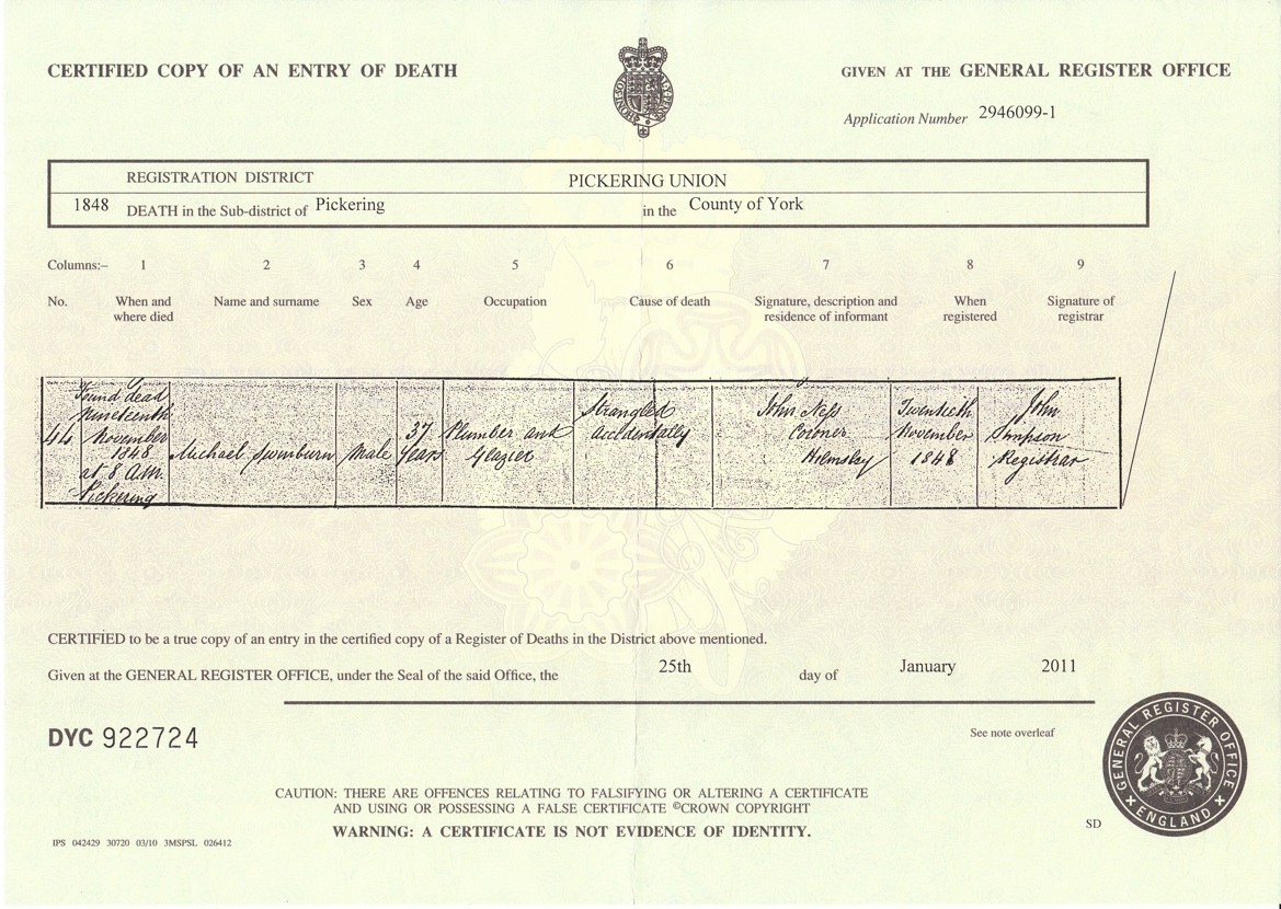 Michael Swinburn died in 1848 at the age of only 37. The death certificate shows that he died a mysterious and sudden death. He was found dead at 8am on 19 November 1848. The cause of death is given as ‘strangled accidentally’ and the body clearly went for examination by the coroner who is listed as the informant.