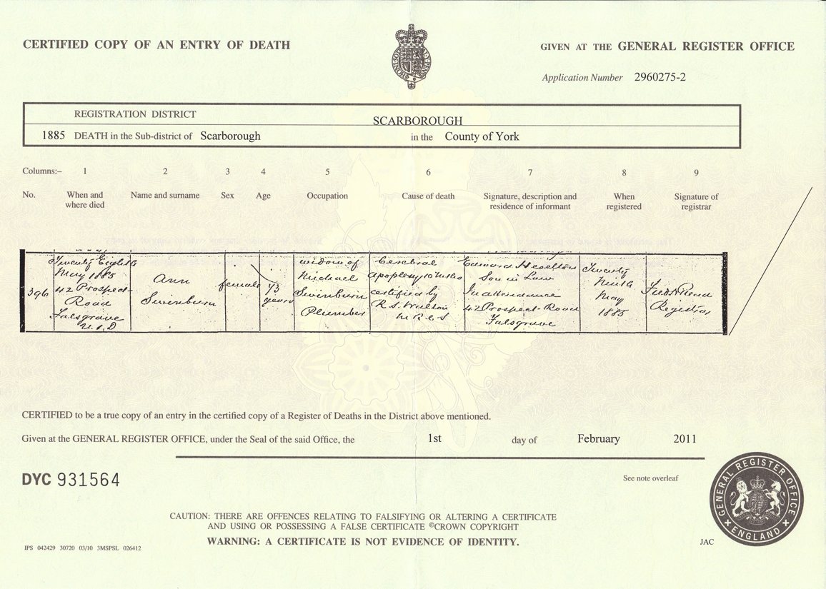 Ann remained in Scarborough until her death living in Victoria Street in 1871 and 1881 and dying 10 months after suffering a stroke in the nearby Prospect Road (perhaps the home of her daughter Mary Ann) on 28 May 1885. Her daughter’s husband, Edward Hanson, who was in attendance, registered her death.