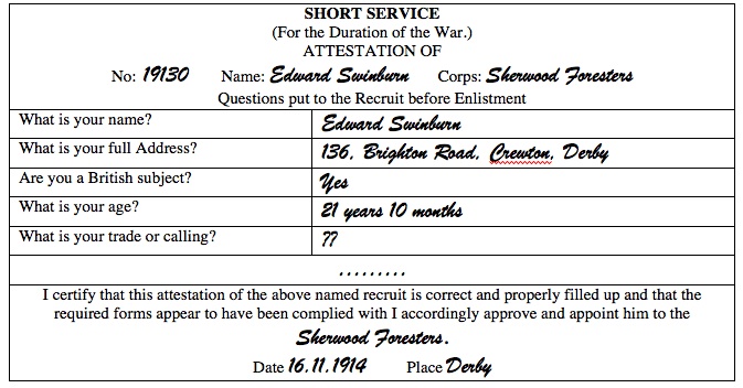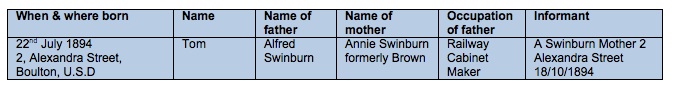 Tom Swinburn was born on 22nd July 1894 at 2, Alexander Street, Boulton, Derby. His mother registered the birth some time later on 18th September 1894.