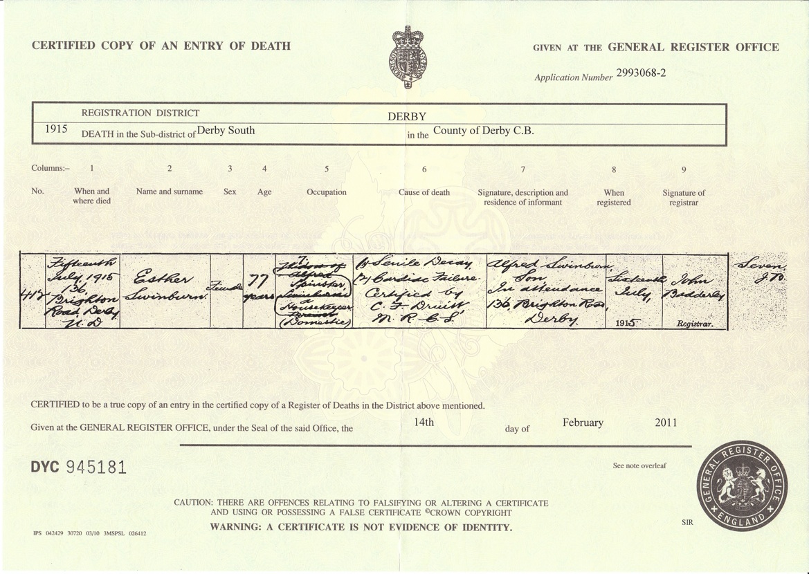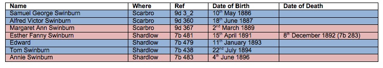 George remained unmarried and died in 1936 at the age of 50 of TB. I was told by my Dad - R D Swinburn, that his Uncle George spent his last months in Derby Sanatorium and that when his TB was diagnosed all the family had to go to be tested. Fortunately they were all clear of the disease.