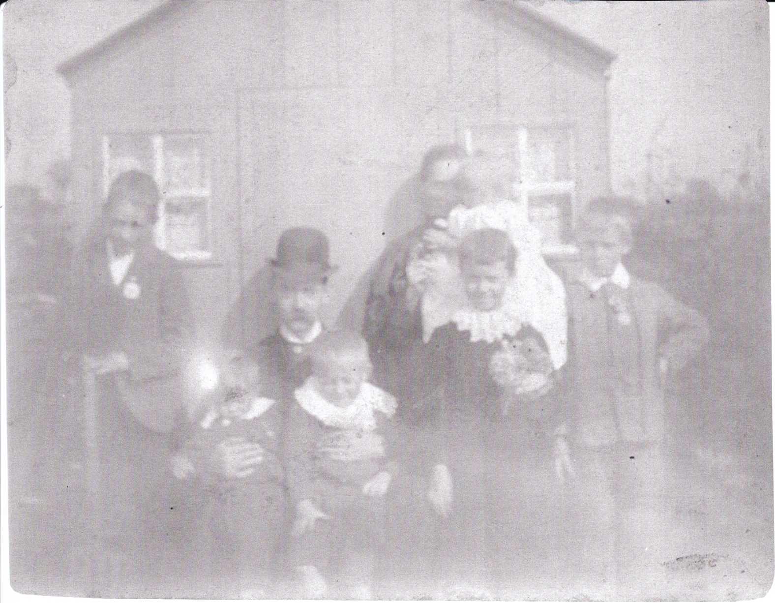 The photograph shows Alfred and Annie with their 6 children. George (b1886) is standing on the left and Alfred (b1887) on the right. Margaret (b1889) is standing in front of her mother who is holding the baby Ann (b1896). Seated on Alfred’s knees are Tom (b1894) and Edward (b1893).
