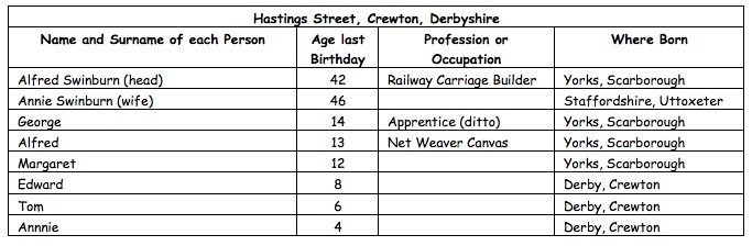 Alfred had a new job. On previous census forms his occupation is recorded as cabinet maker but now he is putting his skills to work as a Railway Carriage Builder. The ‘ditto’ indicates that his son George was an apprentice in the same trade.