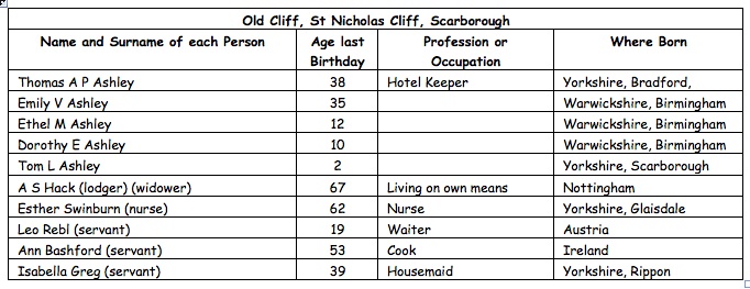 For several decades Esther had worked in the service Robert Fenwick. However by 1901 she was no longer with him - he had been 81 years old in 1891 and so may well have now died. Esther was now was working as a nurse, looking after the youngest child of the Ashley family, owner occupiers of a hotel in Scarborough. The precise address is not clear but is close to St Nicholas Cliff - a cliff top road with many hotels.