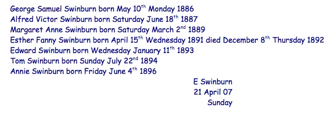After the birth of Annie in June 1896 the family of Alfred and Annie Swinburn was complete. The following registrations are to be found on FreeBMD. (Esther born 1891 lived only for 19 months. This accounts for the 4-year gap between Margaret and Edward).