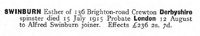 In the 1911 census Esther Swinburn (Alfred's mother) was staying with her sister Mary Ann at 4, Aberdeen Terrace Scarborough. This is the house next door to number 6 where Esther was Housekeeper for Robert Fenwick in 1881 and 1891 (see Swinburn line <1900 for details).