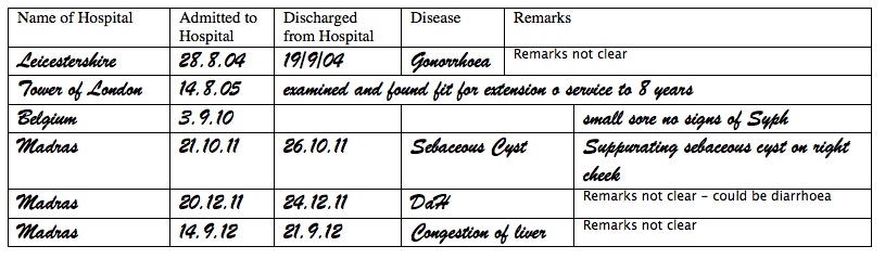 Page 5 of the service record has a table of admissions to hospital. Much of this is hard to read but the dates confirm some of the details of where he was when. The Gonorrhoea diagnosis is clear enough although I cannot read the Remarks.