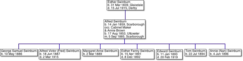 Alfred Swinburn was the illegitimate child of Esther Swinburn and was brought up by his grandmother, Anne, while Esther spent her life unmarried and working in service in various households in Scarborough from 1861 until the turn of the century. The full story of Alfred's upbringing is told in the separate section on the Swinburn family pre 1900.